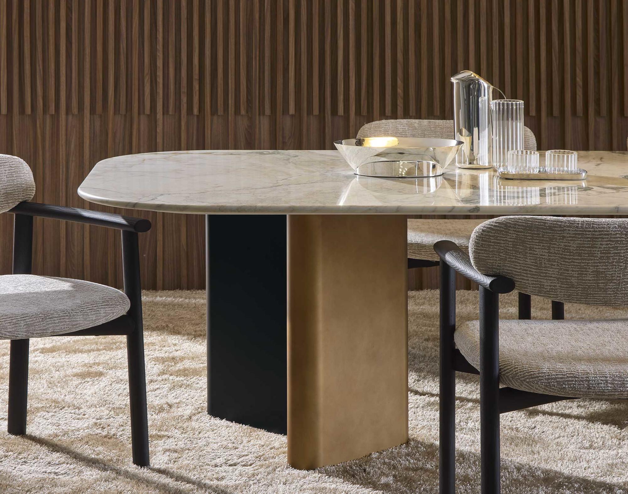 The Onno family of dining and occasional tables is characterised by its organic, sculptural form, which gives them great lightness despite their size. This is particularly evident in the design of the rounded legs, which create an interplay of volumes and contrast with the lightness of the table top.